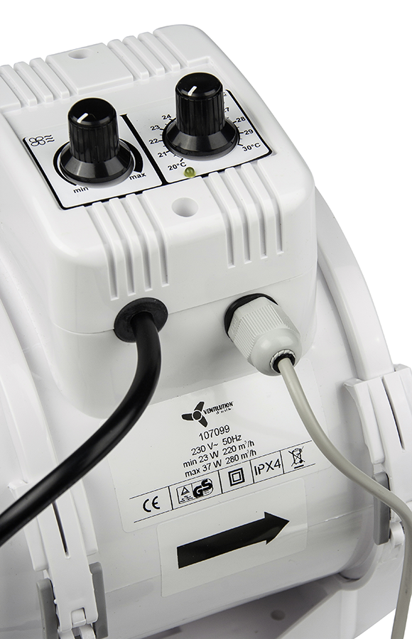 Ventilution Mixed In-Line, 220/280 m³/h, für 125 mm Rohr, mit eingebautem Regler + Thermostat, IEC Connector